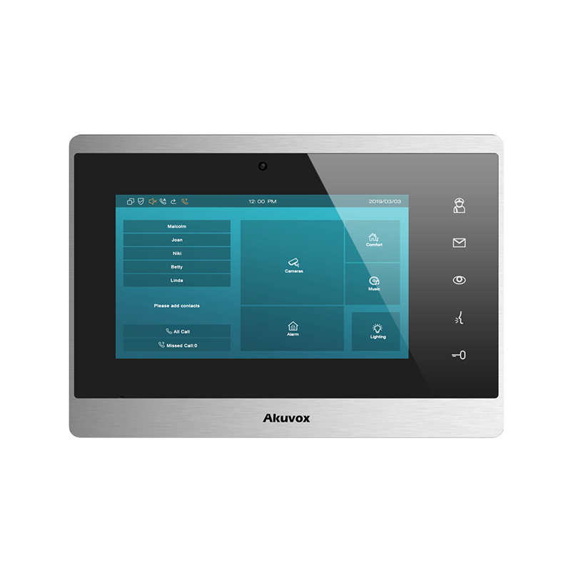 پنل داخلی آیفون هوشمند Akuvox مدل IT82W دارای صفحه نمایش 7 اینچی میباشد. مانیتور هوشمند IT82W آکووکس قابلیت ارتباط صوتی و تصویری با پنل خارجی آیفونها را دارد. بوسیله آیفونهای هوشمند آکووکس میتوانیم با دیگر واحدها ارتباط صوتی و تصویری برقرار کنیم.